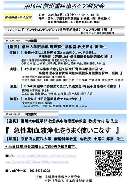 2026年1月31日(土)15:45~18:00に第16回信州重症患者ケア研究会を信州大学医学部附属病院(現地+Web)… 詳しく見る